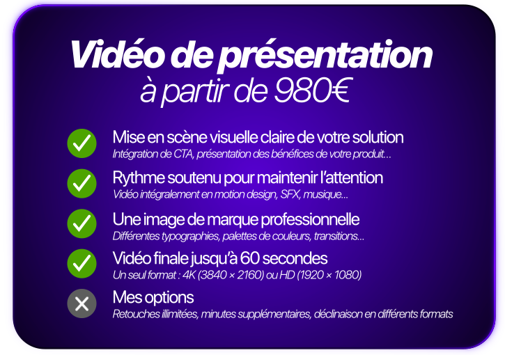 Votre vidéo travaille pour vous : elle capte l’attention en quelques secondes, explique votre offre simplement et transforme vos visiteurs en clients.